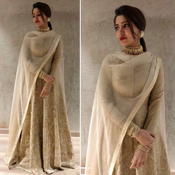 Dressed in a festive ensemble by JADE by Monica and Karishma, Samantha takes our hearts away with this one. Loving the nude shade on her that she keeps simple with a statement choker and earrings and luscious lips.